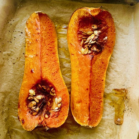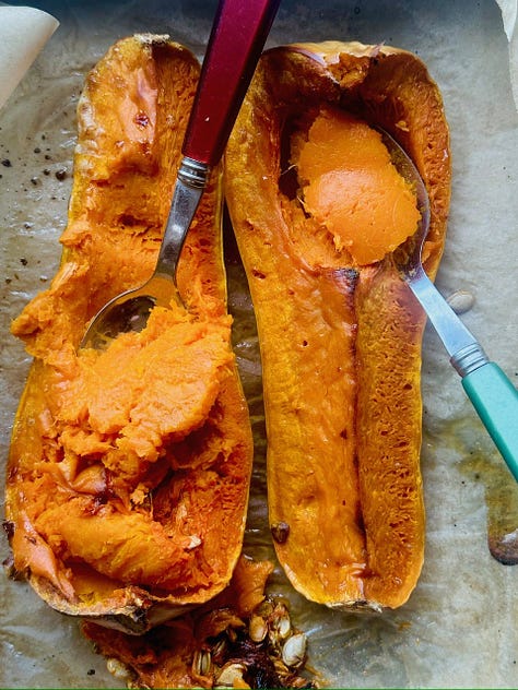 I push that idea by baking it in the half or quarter piece, which has the added advantage of not having to peel or chop or remove seeds. If you’re happy to peel and chop into smaller chunks, at least you’ll save on baking time – just toss them in a little olive oil and bake until tender, without allowing them to brown too much. We’re going for bright here, not brown.