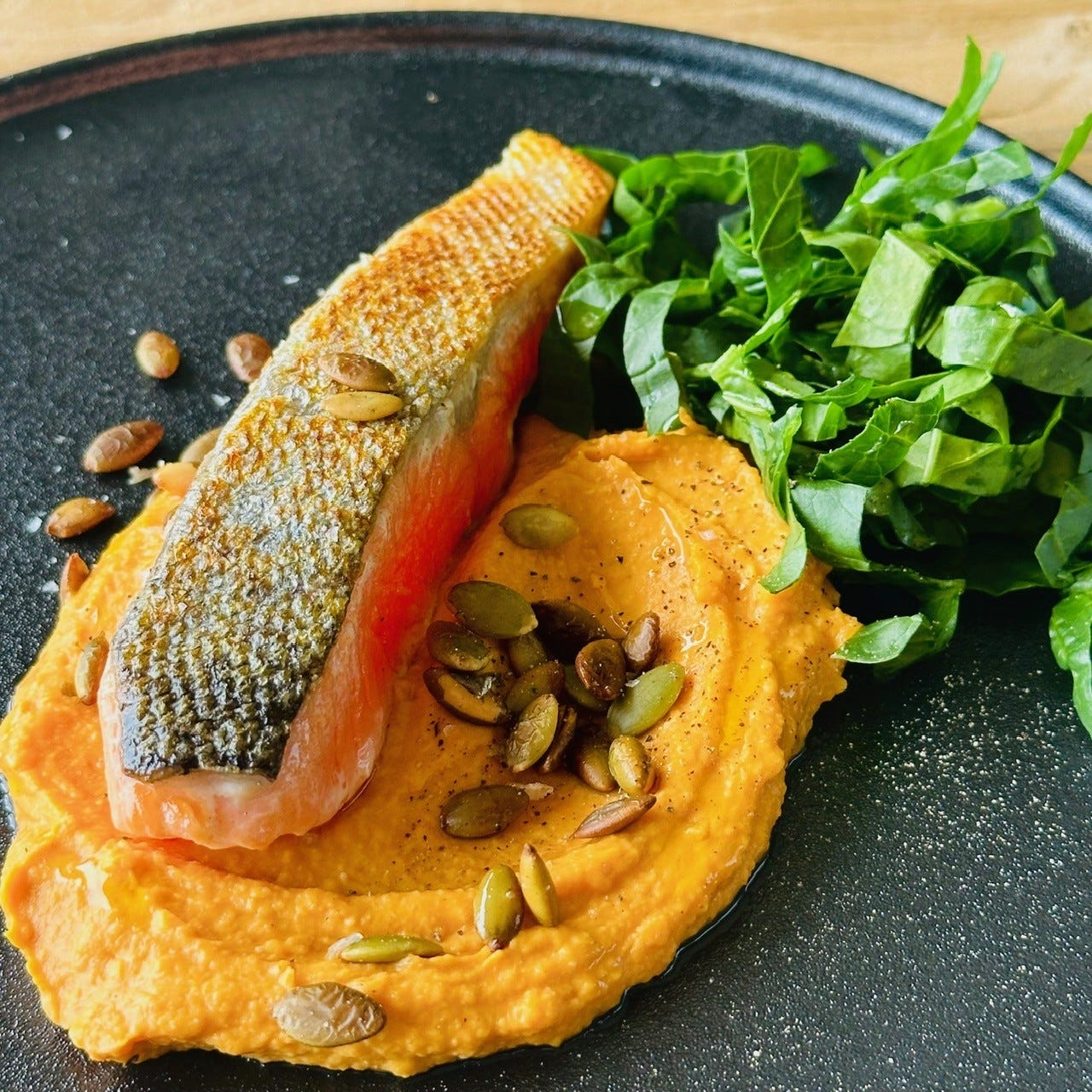 Back to the hummus. He bakes the butternut squash until the flesh is soft, then whizzes it with tahini (sesame seed paste) and olive oil, thinning it out with water and seasoning it with salt. It’s served, rather sweetly, with crisp-roasted pumpkin seeds, a dusting of za’atar, and a drizzle of pumpkin seed oil.